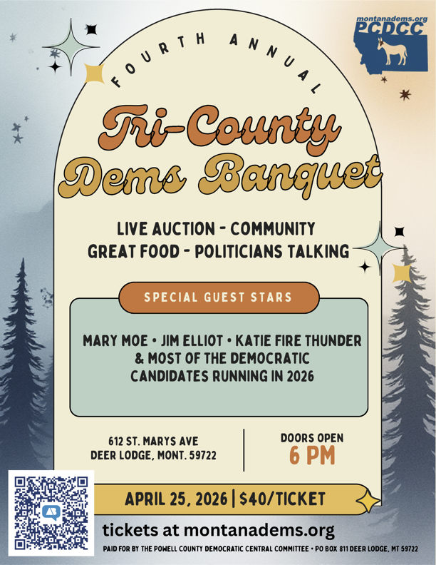 Join Deer Lodge, Granite, and Powell Counties for their annual tri-county banquet. Hear from your Democratic Candidates, guest speakers, and more. $40/ticket available at montanadems.org.