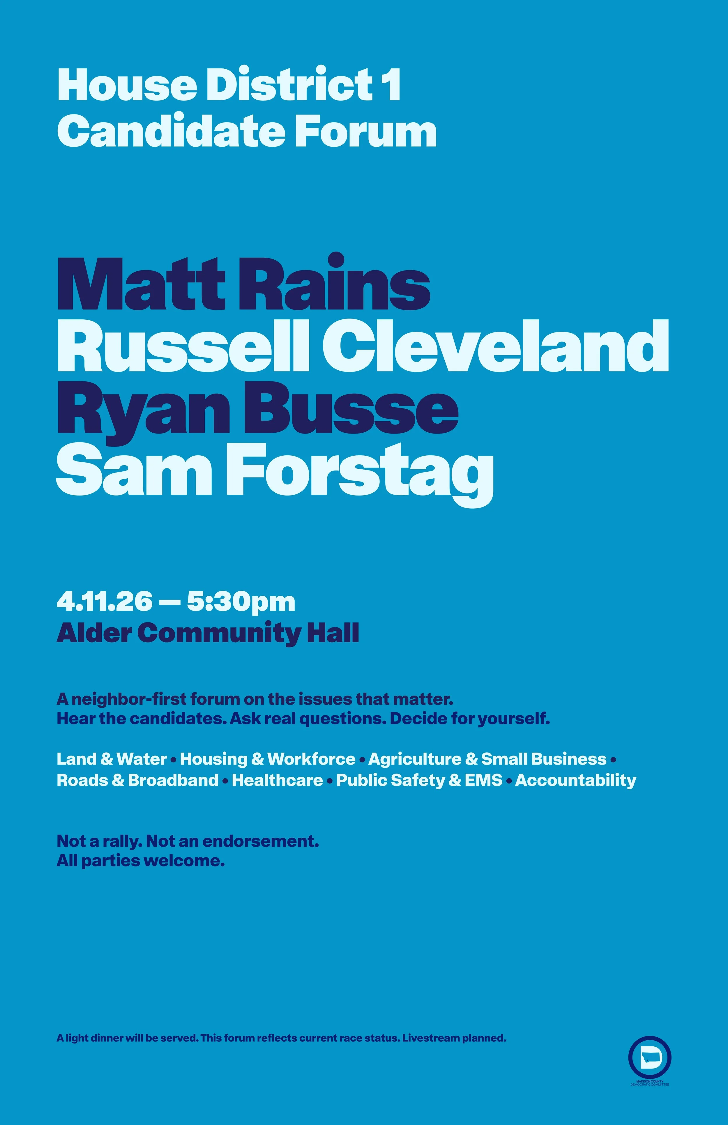 The event will feature HD1 candidates Ryan Busse, Russell Cleveland, Matt Rains, and Sam Forstag, who will discuss their platforms, share their vision for Montana’s future, and answer questions from the public.