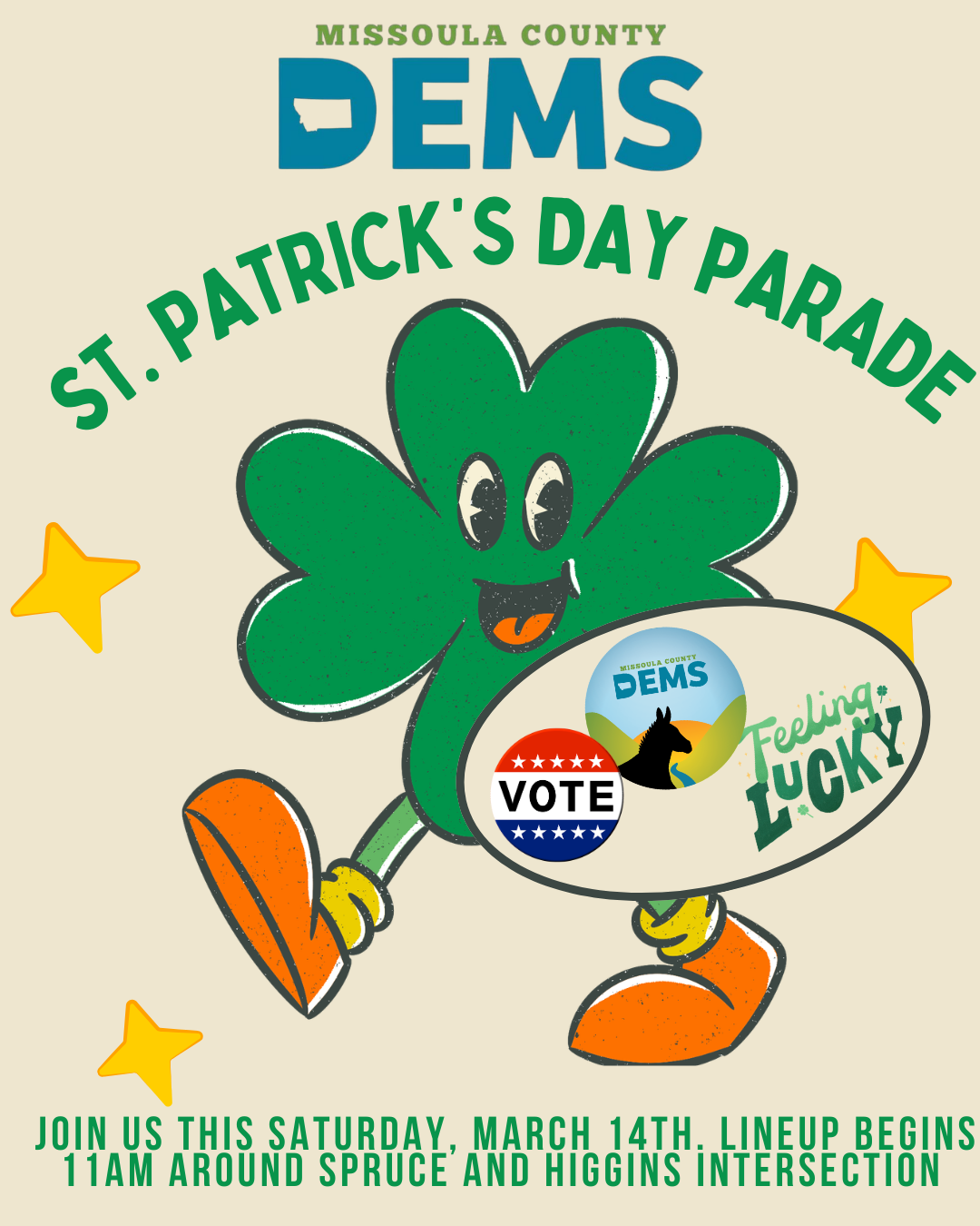 We love a parade! Walk with candidates running for office and the Missoula Democrats in the St. Patrick’s Day Parade on Saturday, March 14. The parade starts at Spruce and Higgins and goes to Grizzly Grocery (Beckwith and Higgins). Lineup begins at 11 a.m. and the parade starts at 12 p.m. Look for the tractor pulling some hay bales and walk along with us!