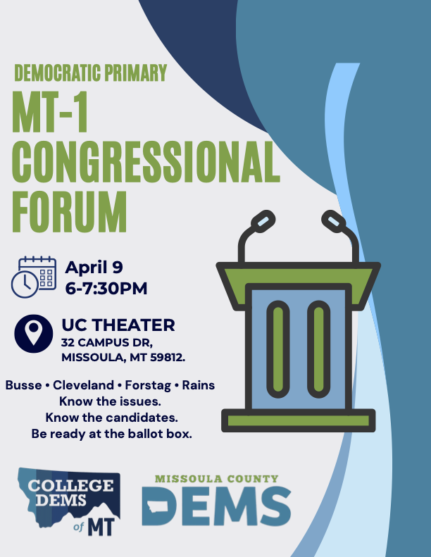 SAVE THE DATE! Join the University of Montana College Democrats and the Missoula County Democrats for our Democratic Primary Congressional Forum on April 9th from 6:00–7:30 PM at the University Center Theater.
