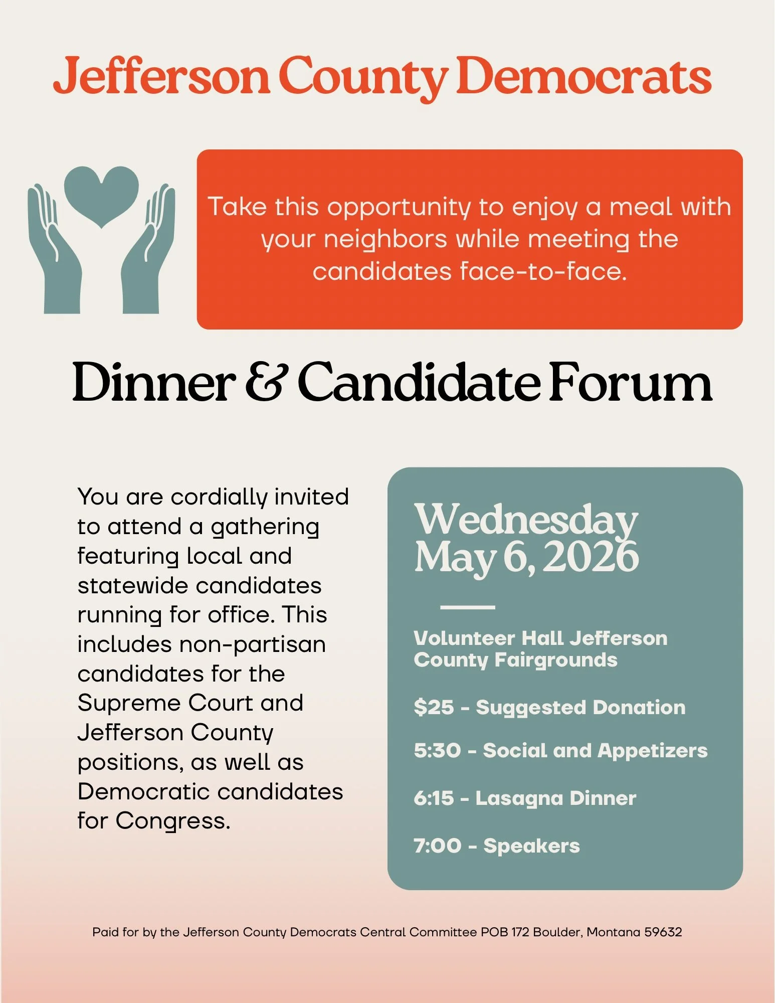 Join Jefferson County Democrats for a great evening! Social, dinner, and Democratic candidates!