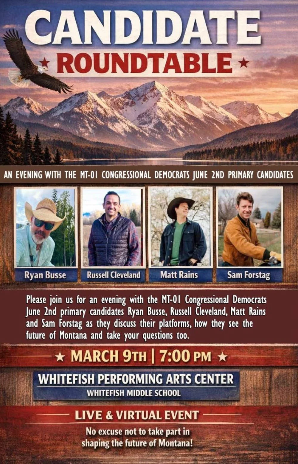 Whitefish, MT — March 9, 2026 — Voters in Montana House District 1 are invited to attend a public candidate roundtable discussion on Monday, March 9 at 7:00 p.m. at the Whitefish Performing Arts Center (Whitefish Middle School).
